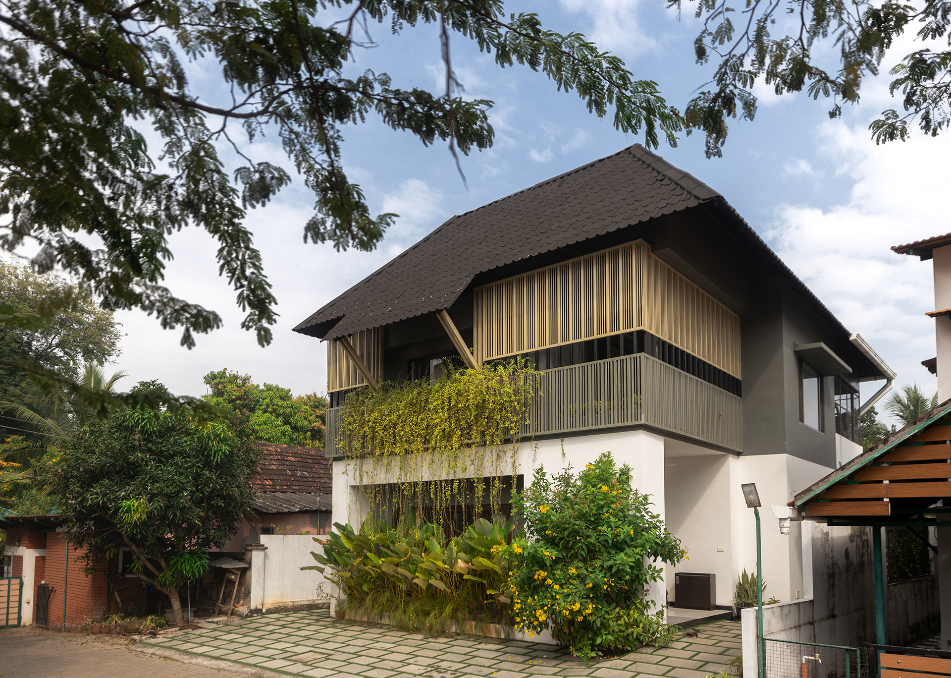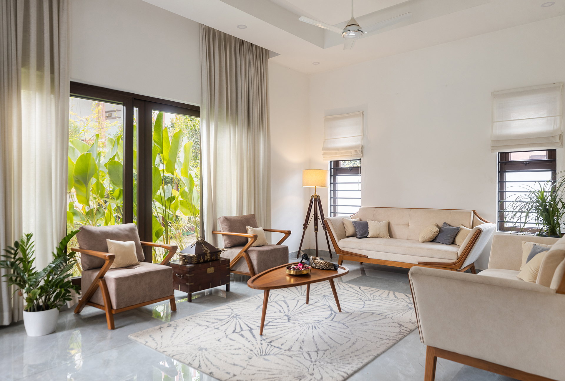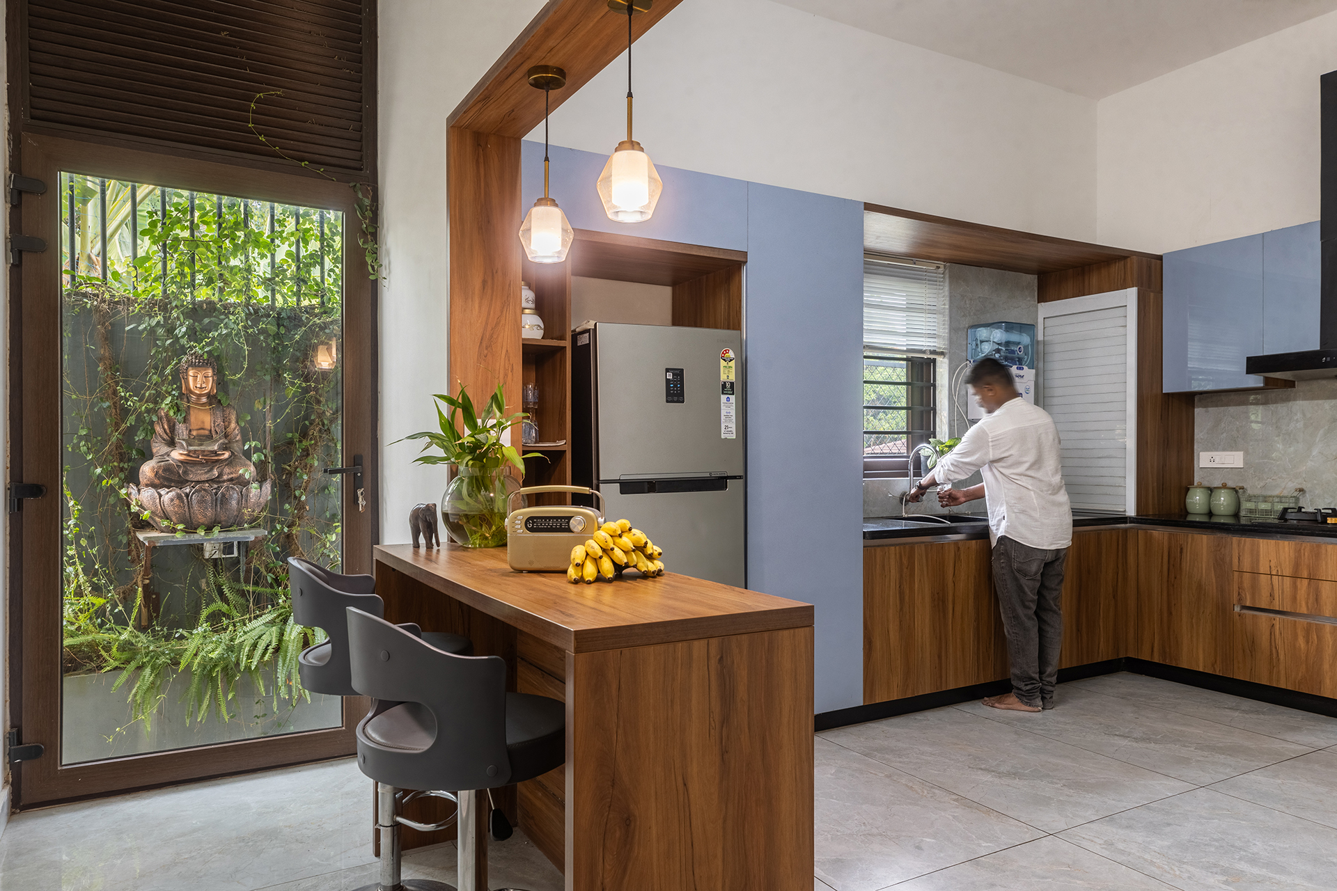 Poonkattu, is a serene and contemporary residence designed for Dr. Ajith and Parvathy in Kottayam. Nestled in a layout development, this iconic single-tiled roof abode seamlessly blends traditional elements with modern twists. The exterior façade, subtle and understated, belies the tranquil oasis within. Strategically placed openings frame the lush greenery outside, infusing the interiors with natural serenity. Inside, light-hued tones and bespoke wooden furniture create a warm, inviting atmosphere. Antique pieces add a touch of elegance, reflecting the owners’ refined taste. Well-planned ventilation ensures a constant flow of fresh air, echoing the name “Poonkattu” and creating a comfortable living space. “Poonkattu” is a haven where modernity meets tradition, and nature’s beauty is woven into every detail.