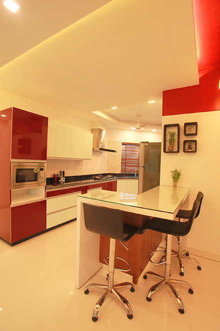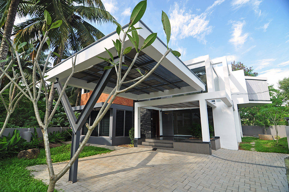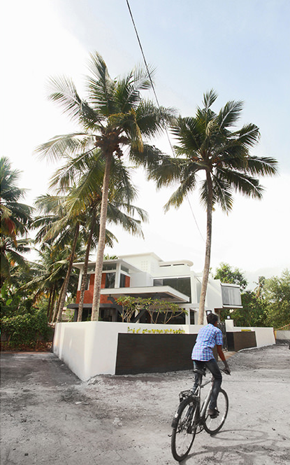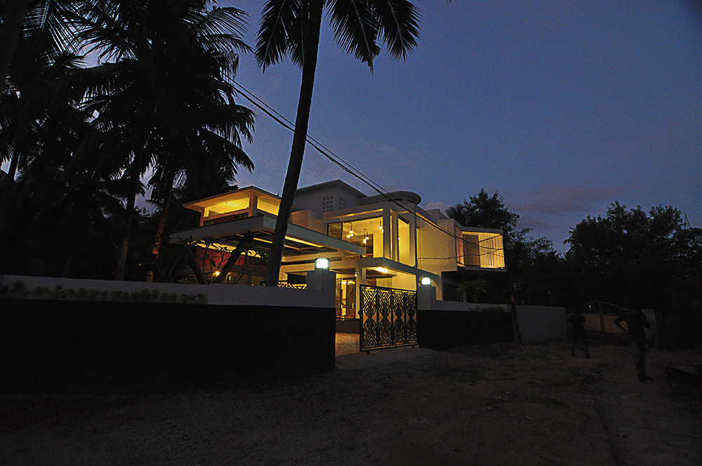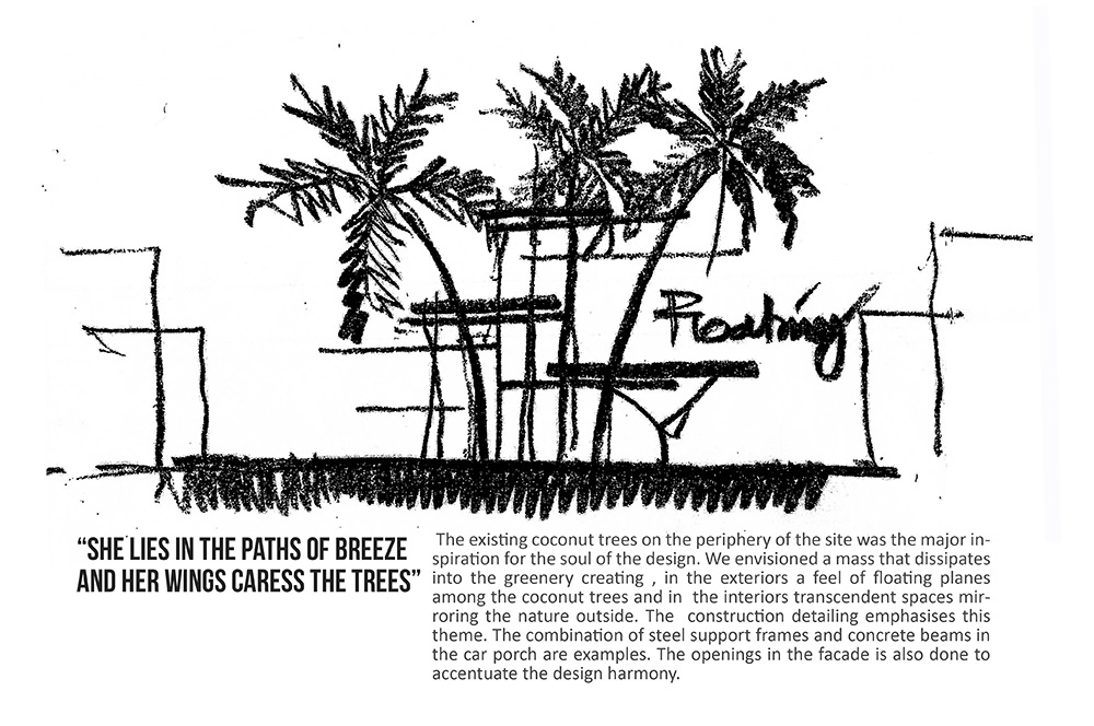 The site is approached from a tight urban neighbourhood, back dropped by open parcels of residential land waiting to be developed in the heart of Trivandrum city. School teachers in UK, the clients brief was for a serene and relaxing home for their vacations and after retirement. The positioning of the house is based on the parameters of capitalising the strong breeze flowing throughout the day and to create open spaces for gathering of friends. The existing coconut trees on the periphery of the site was the major inspiration for the soul of the design. We envisioned a mass that dissipates into the greenery creating , in the exteriors a feel of floating planes among the coconut trees and in the interiors transcendent spaces mirroring the nature outside. The construction detailing emphasises this theme. The combination of steel support frames and concrete beams in the car porch are examples. The openings in the facade is also done to accentuate the design harmony.
