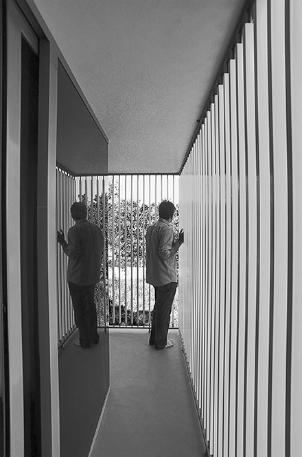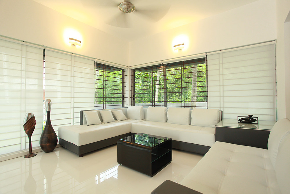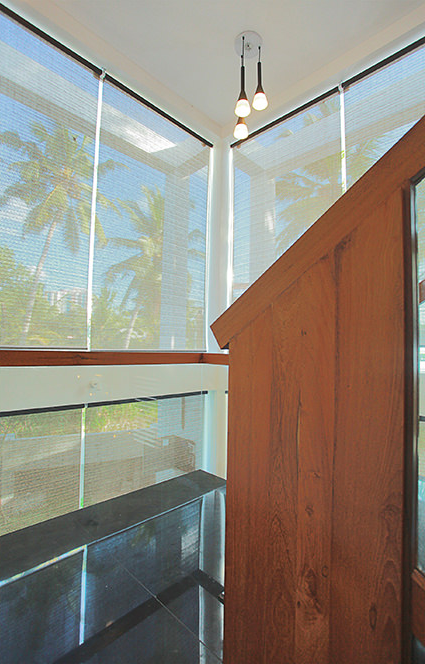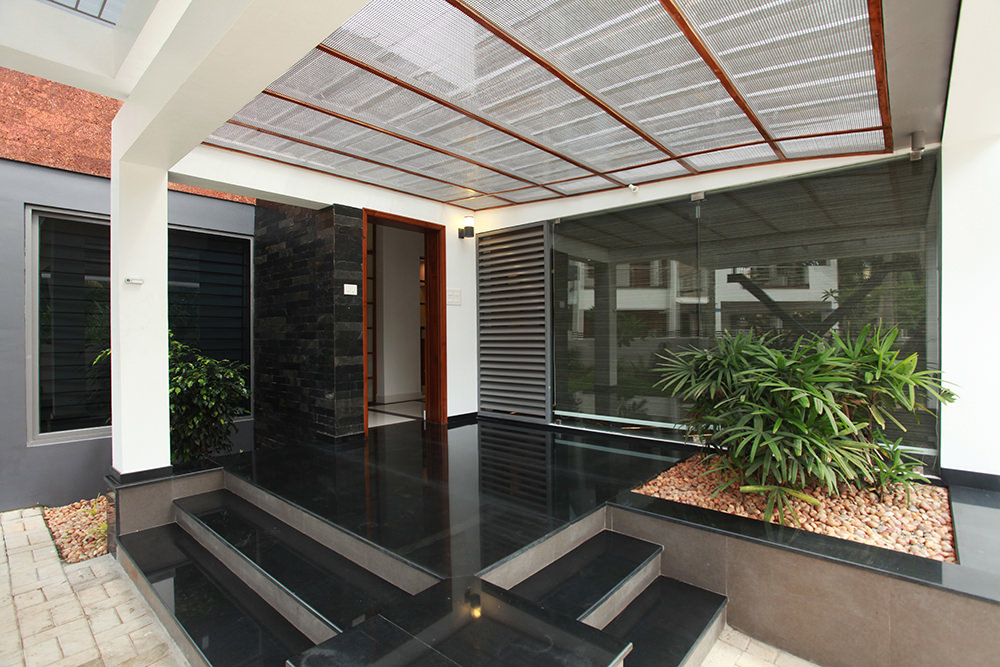 As one steps into the cool interiors from the strong glare of the tropical Kerala sun, the effect is instantaneously relaxing. The openings are so arranged to create “pause spaces” with a view to the green pockets in the urban neighbourhood. The dark shallow fish pond with ferns recreate the lush green ambience of the Kerala tropics. Louvered windows set along the water pond have been aligned in the breeze ways with openings in the opposite side so to enhance cross ventilation and thermal cooling. This would also help to reduce heat gain if any, from the large openings.