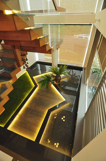 The living area in the upper floor is spread over 3 finely demarcated spaces. Each room or living zone has been carefully designed to experience nature unique at the particular point – each offering a special feel – such as the green foliaged tree house feel in the upper living room with a unhindered view of the coconut tree tops. The view has been set in such a way that the nearby residences cannot be seen. The first floor bedroom overlooking the brook giggling away nearby. The Master bedroom has been planned with the lounge and the sleeping space at different levels. Spaces have been designed to encourage the awareness of transition from experience to experience. Each transition evokes fresh and varied experience offering wide range of relaxation points.