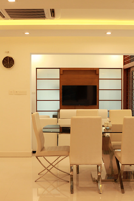 The ground floor houses the formal living room, dining room Kitchen, work area , store and the guest bedroom with toilet. The clients wanted a living zone with a TV viewing space , kitchen , dining and a reading corner, but with the ability to transform into a spacious party space with appropriate ambience.